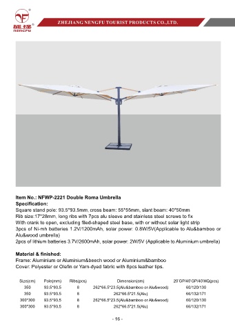 2pcs of lithium batteries 3.7V/2600mAh, solar power: 2W/5V (Applicable to Aluminium umbrella)