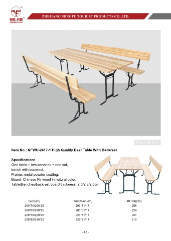 Item No.: NFWU-2417-1 High Quality Beer Table With Backrest